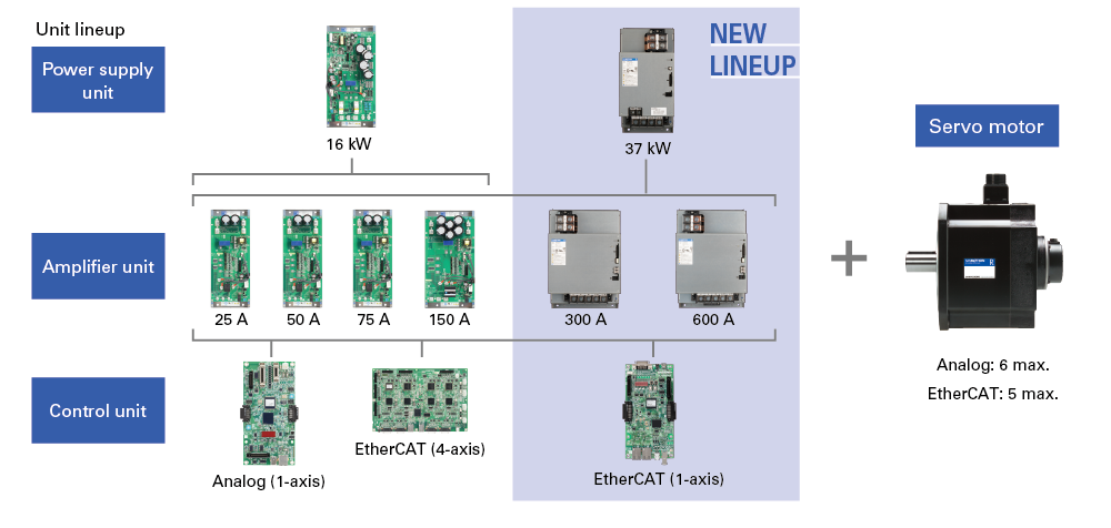 Variations of the servo system’s control, power supply, and servo drive units are available for selection to build multi-axis servo systems that best suit engineering’s requirements.
