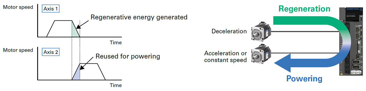 The regenerative energy generated during the deceleration of one axis can be effectively reused to power the other axis, contributing to energy savings in the equipment and supporting the SDGs.
